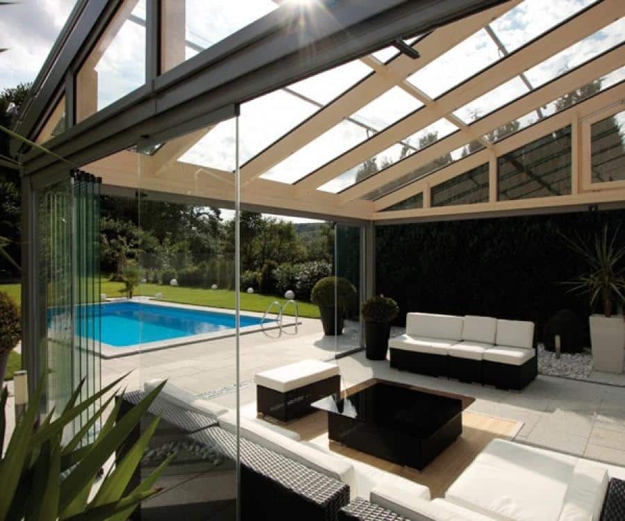 Door de zijkanten af te sluiten met een vaste beglazing ontstaat er een mooie en beschutte ruimte met veel glas en licht die de perfecte overgang vormt tussen natuur en woning. Het is ook mogelijk een spiekozijn op een scheidingsmuur of rechte glaswand te plaatsen.