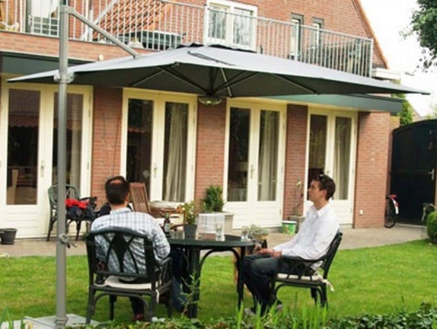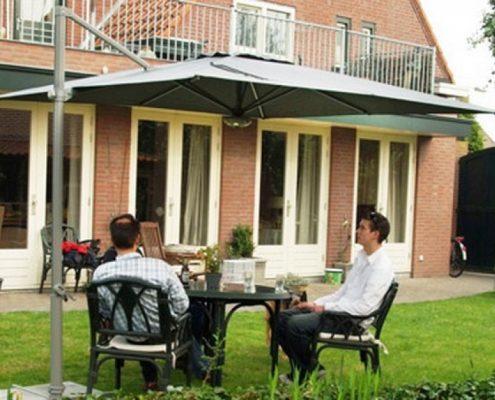 Natuurlijk is het bij felle zon heerlijk toeven onder een parasol, maar ook wanneer de schemering valt kan een parasol uitkomst bieden. Met de verlichting kan een gezellige sfeer gecreëerd worden en tevens blijft de warmte hangen onder het doek, waardoor uw avond verlengd wordt.