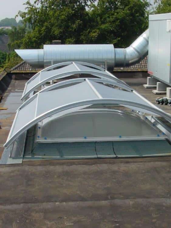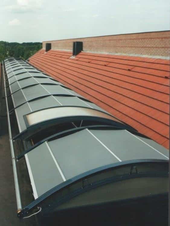Het gebogen Topspin systeem wordt aan de buitenzijde op de aanwezige lichtstraat gemonteerd. Van halfrond tot licht gebogen. De geleiders worden exact in de gewenste radius gewalst voor het beste en het mooiste resultaat.