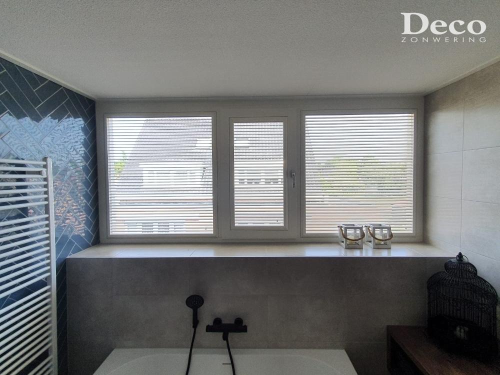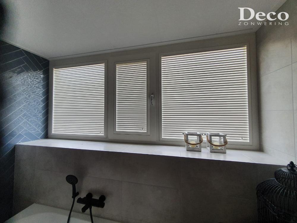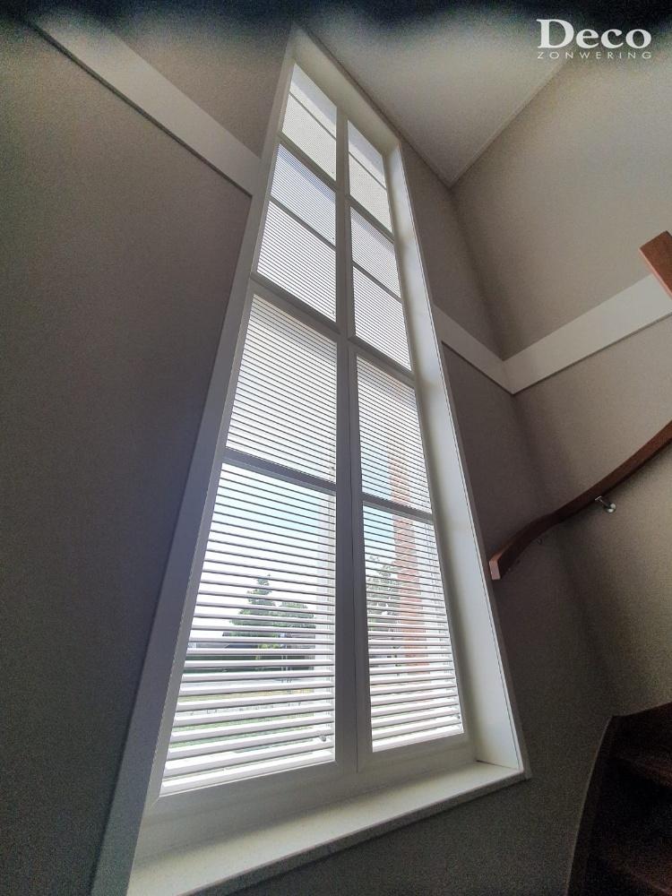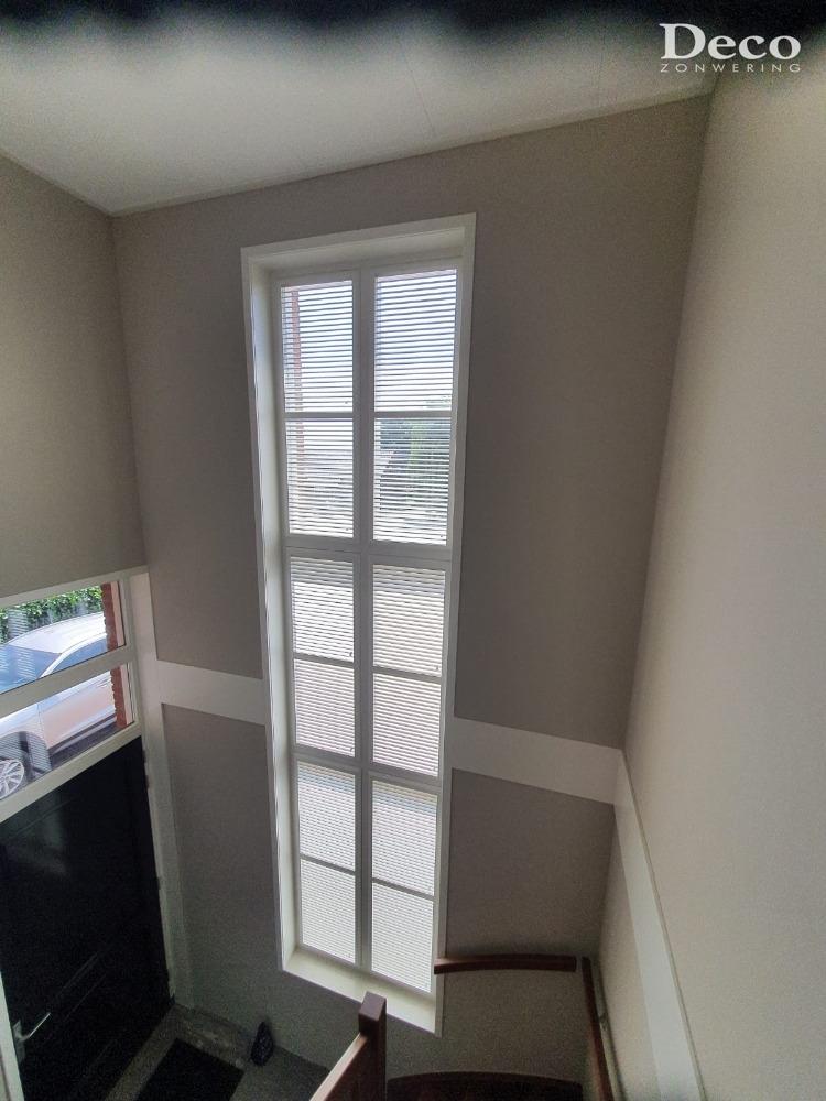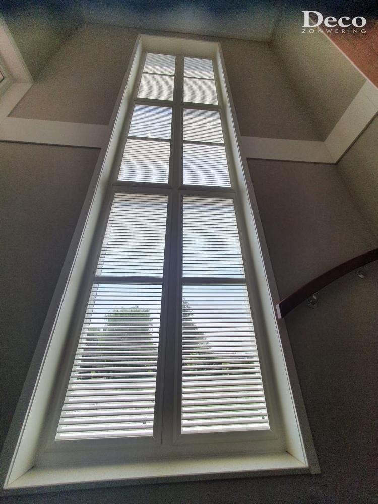 De lamellen zijn kantelbaar. Hierdoor is de lichtinval perfect te regelen. In de badkamer kan alles dichtgedraaid worden voor privacy en vervolgens erg gemakkelijk weer open gezet worden voor licht en ventilatie. De raampartij van de hal is erg hoog. Dit geeft een erg mooie lichtinval in de ruimte. De kantelbare lamellen zorgen ervoor dat de lichtinval toch beperkt kan worden als bijvoorbeeld de zon vol op die kant van het huis staat. Zo blijft het in de hal wat donkerder en bovendien koeler.