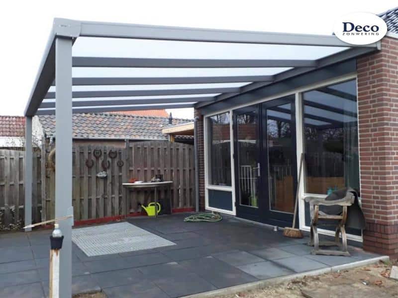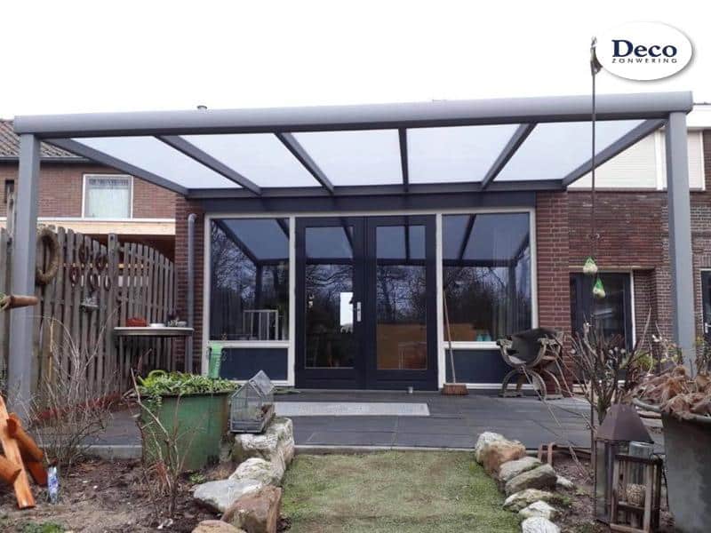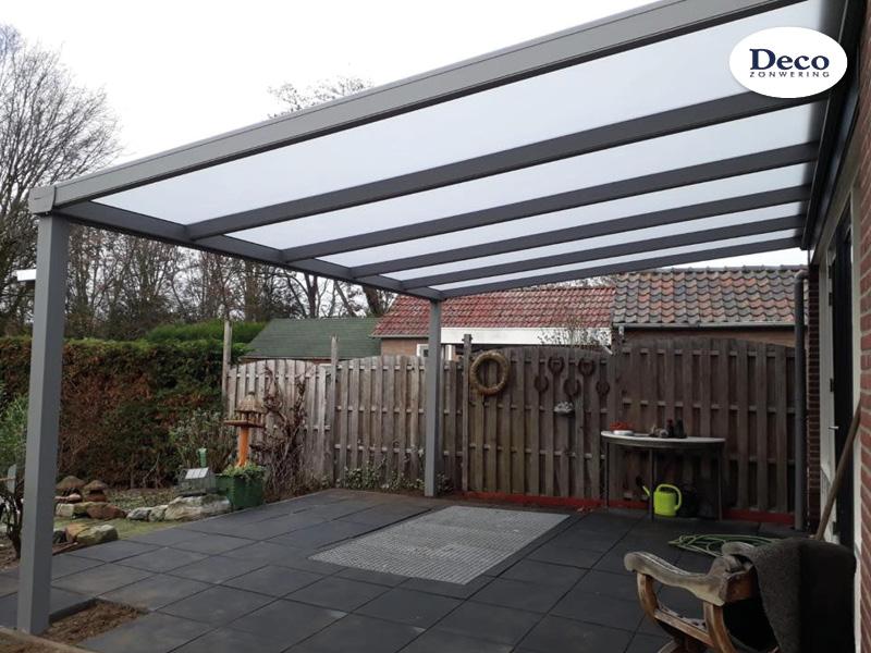 Daarnaast staat de Deco Limited bekend om het hoogwaardige en extra dikke aluminium. Een supersterke overkapping die tot een breedte van maar liefst 7 meter geleverd kan worden. Omdat we voor deze overkapping van 5 meter breed en maar liefst 4 meter diep een aluminium gootversteviging toegepast hebben kan de overkapping makkelijk gedragen worden door twee staanders, een extra staander in het midden was dus niet nodig!