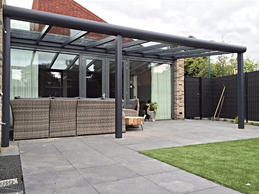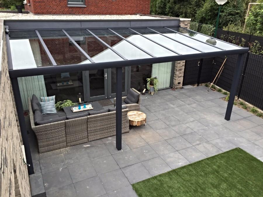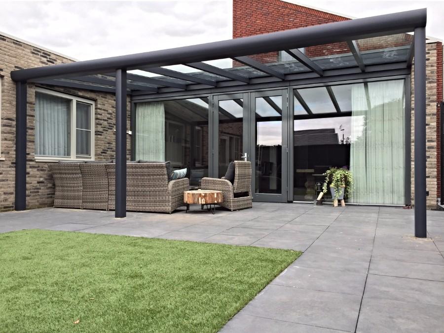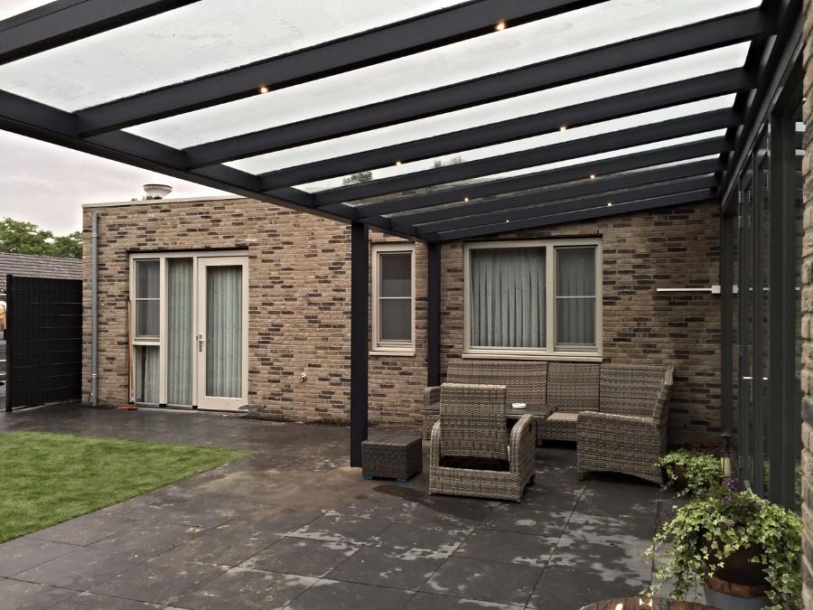 Heerlijk buiten zitten onder een glazen overkapping met geïntegreerde ledverlichting, dat kan met deze overkapping van Verano. Deze is door ons geleverd en gemonteerd in Heesch in een antraciete structuurlak die krasbestendig is. De led verlichting is met een afstandbediening te bedienen en in het dak ligt sterk 5.5.2 helder glas, 10 mm dik!