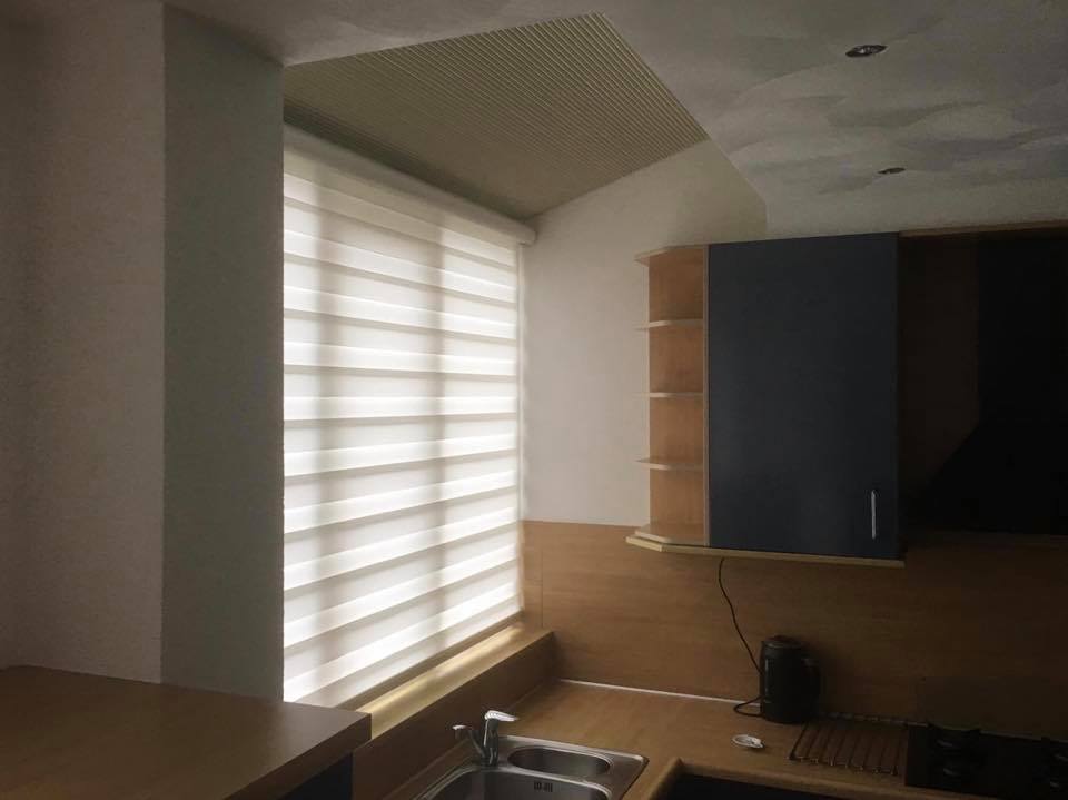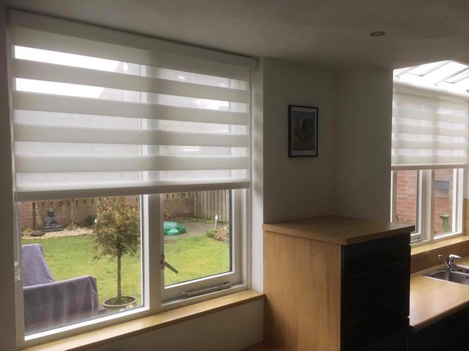 De keuken hebben we voorzien van duo-rolgordijnen. Dat geeft overdag een vrijzicht naar buiten, terwijl ’s avonds de inkijk van buiten naar binnen belemmerd kan worden. Daarnaast is in de lichtstraat van de keuken een verduisterend plissé gordijn geplaatst. Dat zijn heel veelzijdige gordijnen, die ideaal zijn voor moeilijke raamsituaties!