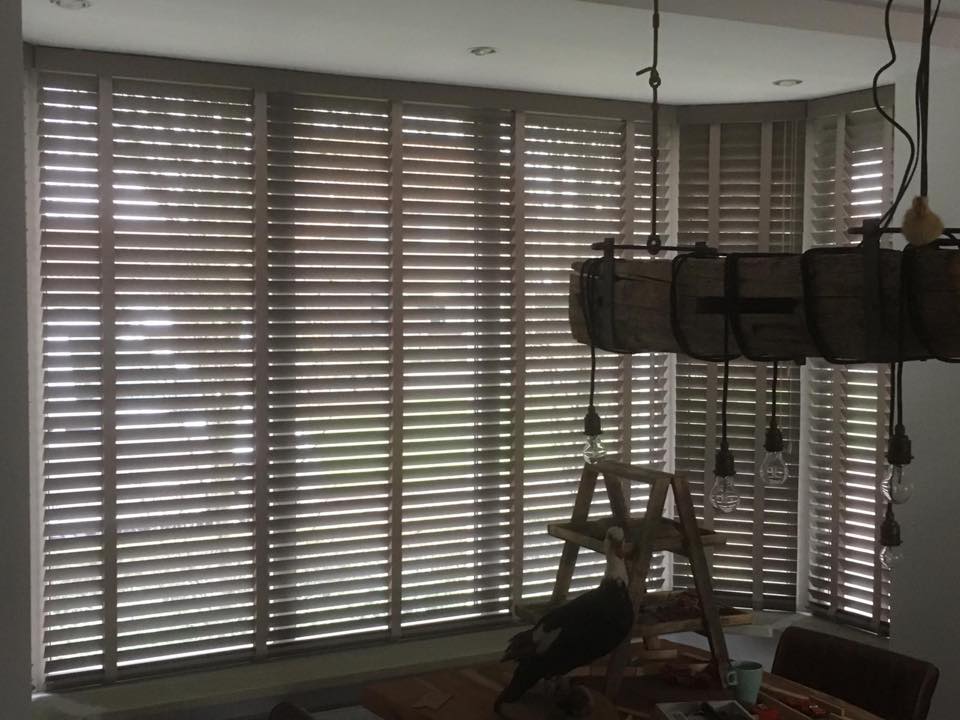 In de erker hebben we prachtige houten jaloezieën gemonteerd. Een ontzettend stijlvolle zonwering die ook nog eens super functioneel is. De klant regelt voortaan eenvoudig de lichtinval en privacy! Daarnaast bieden houten jaloezieën heel veel soorten kleuren en uitvoeringen, in dit geval werd er gekozen voor een moderne ladderband. Een uitstekende keuze die perfect past bij het interieur.