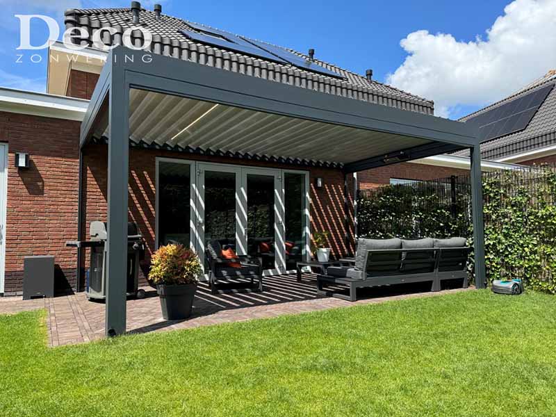 Deze klanten kozen uiteindelijk voor een Stobag Bavona Hardtop. Deze terrasoverkapping heeft een aluminium kantelbaar lamellendak van 600 cm breed en 350 cm diep en is hier uitgevoerd in een antraciet 7016 structuurlak. De luxe terrasoverkapping is voorzien van dimbare ledverlichting in de lamellen en drie windvaste zip screens die volledig zijn geïntegreerd in de constructie. Daarnaast is er een Somfy infraroodverwarming geplaatst. Alle functies zijn eenvoudig te bedienen met een Somfy IO afstandsbediening en via de Tahoma App.