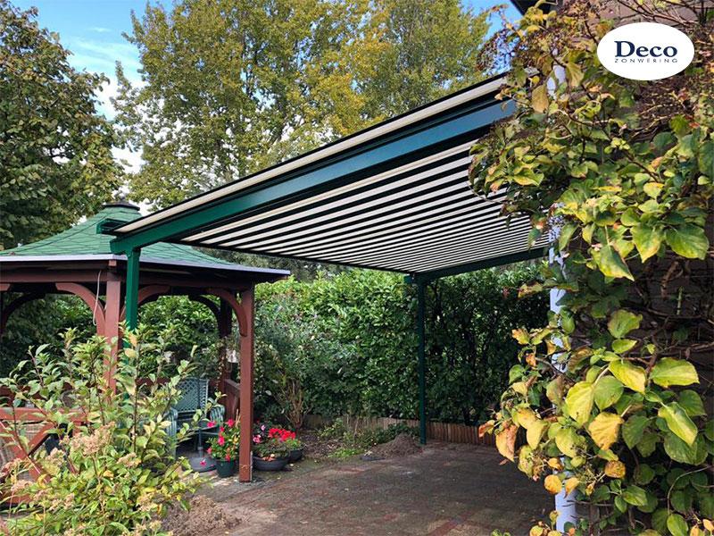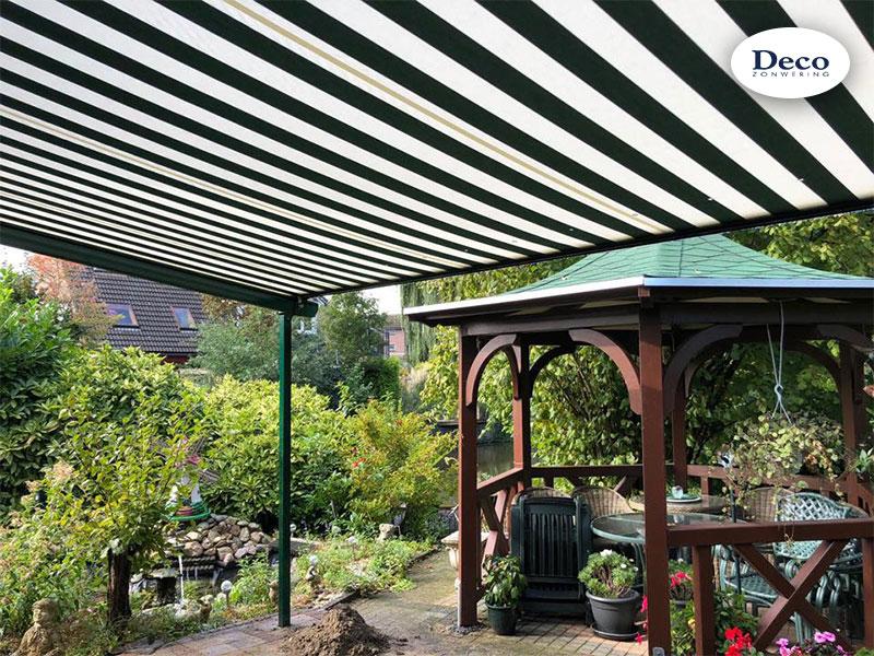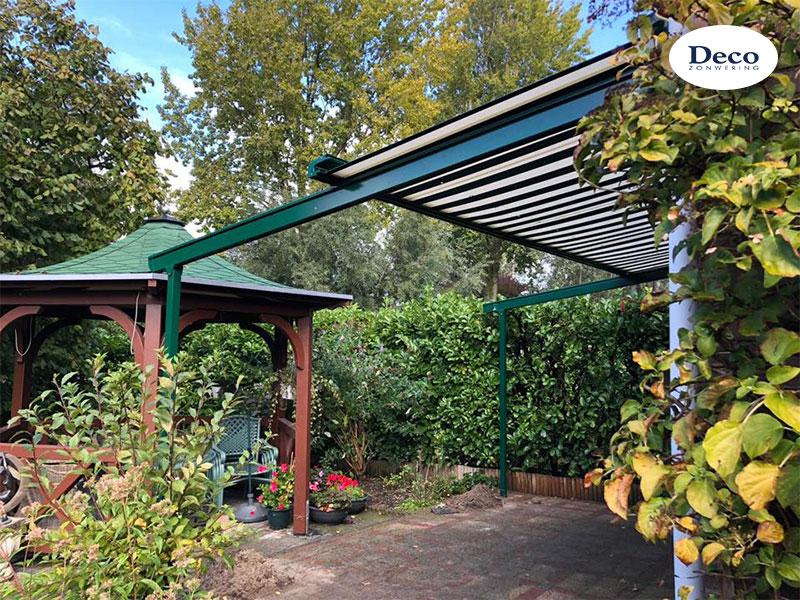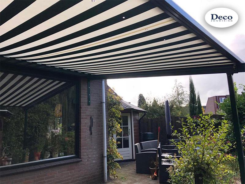 Een klant uit Dordrecht deed op aanraden van zijn familie in Oss (klant van Deco) een aanvraag voor een overkapping. Ze zochten een zonnescherm met een uitval van 3,5 meter diep. Ze willen graag dat met warm weer het gehele terras bedekt kan worden. Daarbij hebben ze het liefst een zonnescherm waarvan het doek niet kan klapperen.