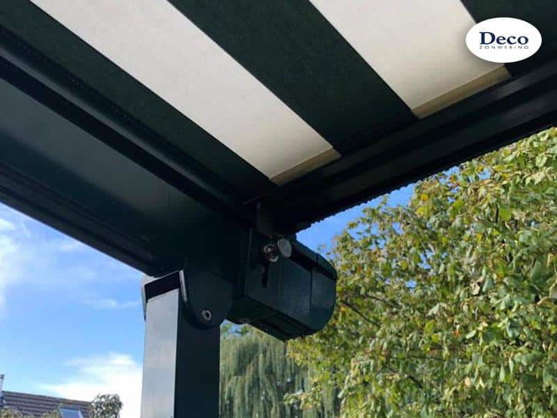 De voorlijstvergrendeling van de Stobag Pergolino zorgt voor een enorm hoge doekspanning, waardoor het doek niet gaat klapperen en eventueel regenwater perfect kan afvoeren. Deze Pergolino zonwering is elektrisch bedienbaar door middel van een Somfy afstandsbediening.