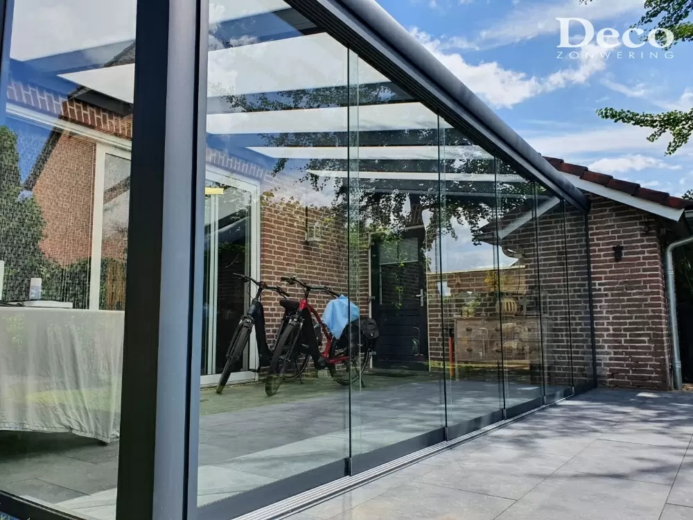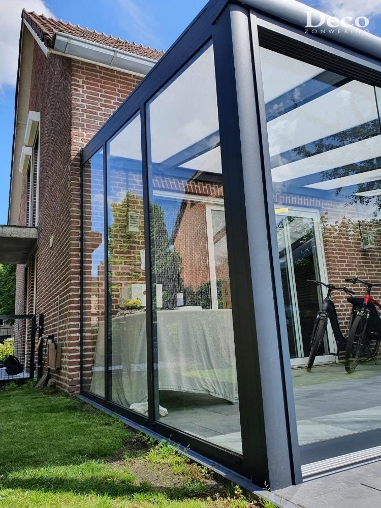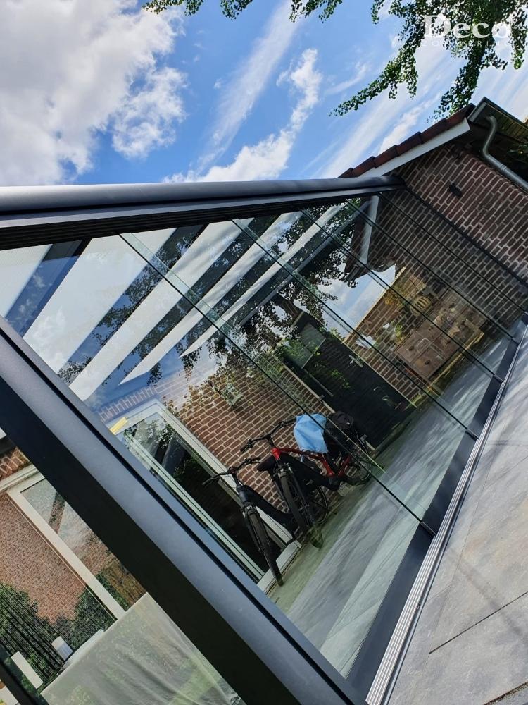 Deze tuinkamer in Lith is rondom afgesloten door glazen schuifwanden en een volledig spiekozijn met veiligheidsglas. Een spiekozijn is een speciaal kozijn die de schuinte van het dak opvult. Hierdoor kan de overkapping helemaal worden afgesloten waardoor men in de tuinkamer altijd uit de wind en regen zit. Zo is de tuinkamer echt onderdeel van het huis, maar door de transparante zijkanten en bovenkant geeft het toch een buitengevoel.