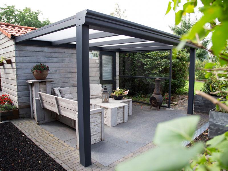 De doekzonwering bovenop zorgt voor de perfecte schaduw. De screens aan de zijkant en voorkant houden de laagstaande zon buiten en zorgen ervoor dat u heerlijk uit de wind zit. Alles is bedienbaar met een Somfy IO afstandsbediening.