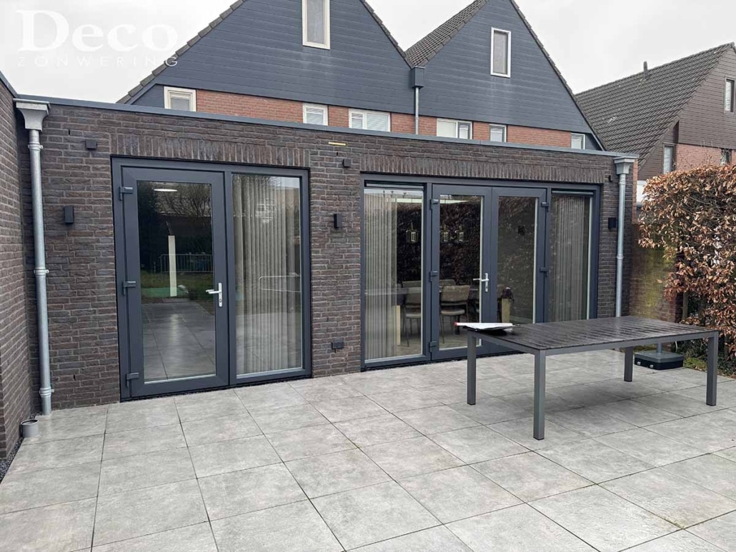 Een zonnescherm aan de gevel van een uitbouw doet veel meer dan alleen schaduw geven. Het is een slimme manier om op zonnige dagen de woning letterlijk én figuurlijk te verlengen. De grens tussen binnen en buiten vervaagt, er wordt in één keer een comfortabele plek gecreëerd om te ontspannen, te lezen of te eten. Het terras blijft beschut tegen de felle zon. Binnen merkt u ook direct het verschil. Zonneschermen houden de hitte buiten, waardoor de temperatuur binnen aangenaam blijft. Dat betekent: minder gebruik van airco of ventilatoren, en dus minder energieverbruik. De meubels, vloer en andere interieurstukken worden bovendien beschermd tegen verkleuring door direct zonlicht. Zo blijft uw interieur langer mooi.
