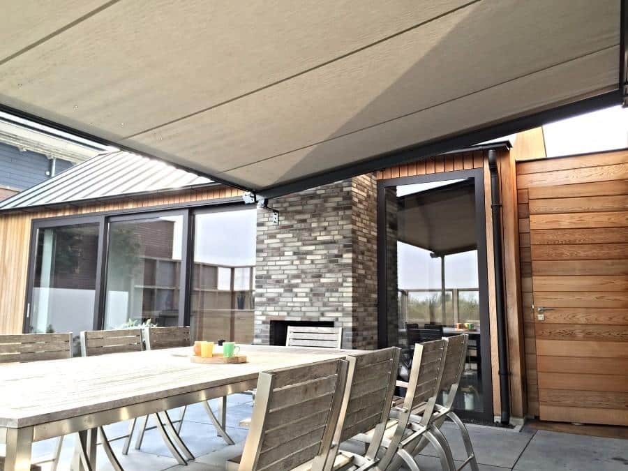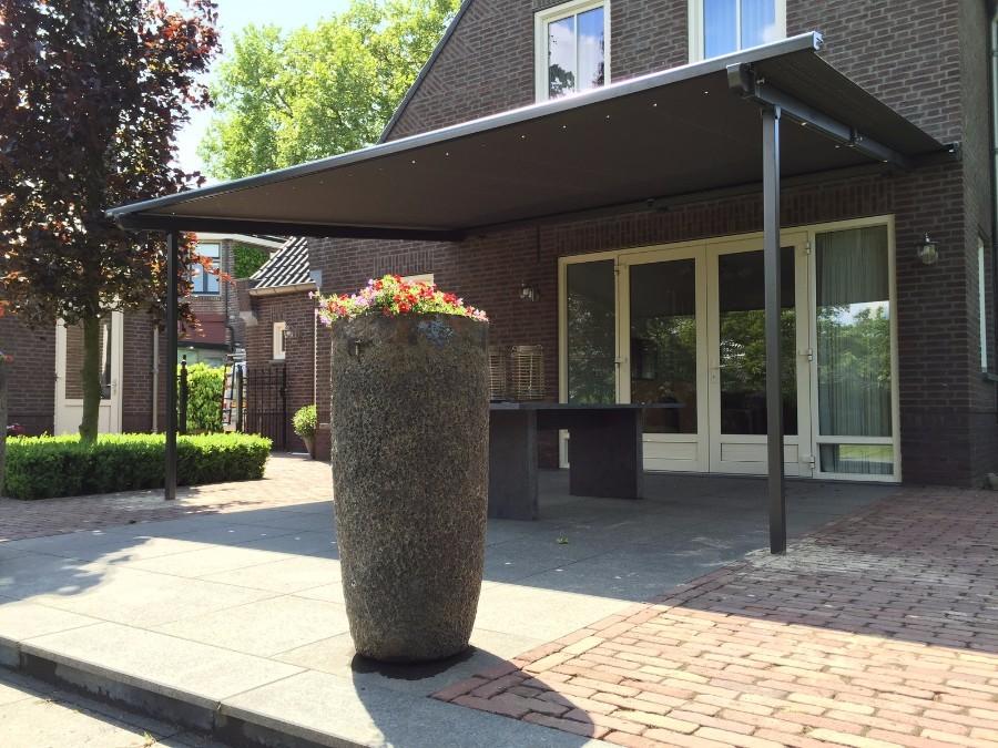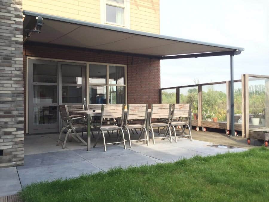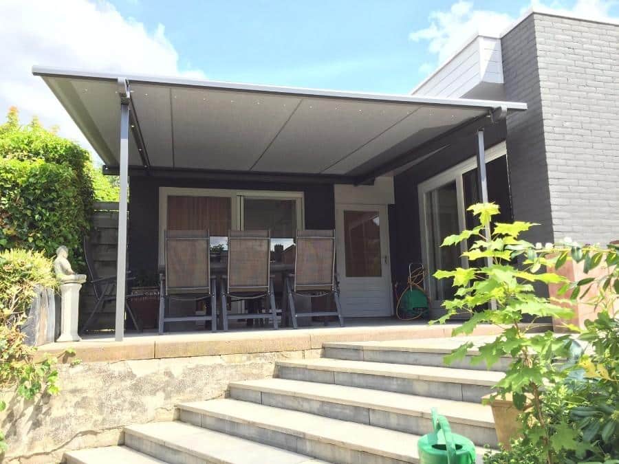 De Pergolino wordt geleverd met moderne, subtiele staanders. Deze staanders ondersteunen de geleiders en bieden een stabiele windvaste constructie. De Pergolino buitenzonwering van Stobag blijft overeind waar traditionele zonwering bij wind en regen opgeruimd moet worden. Hierdoor is het niet alleen een zonwering, maar ook een overkapping omdat het bestemd is tegen een hogere windbelasting en met de juiste hellingshoek zelfs tegen regen.