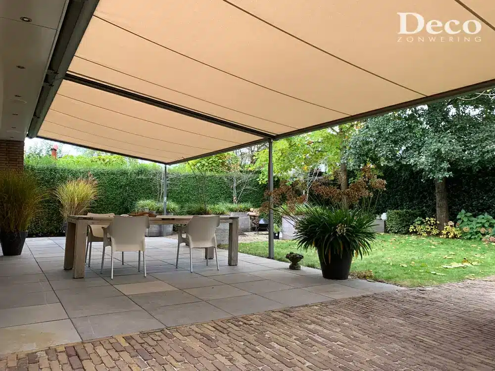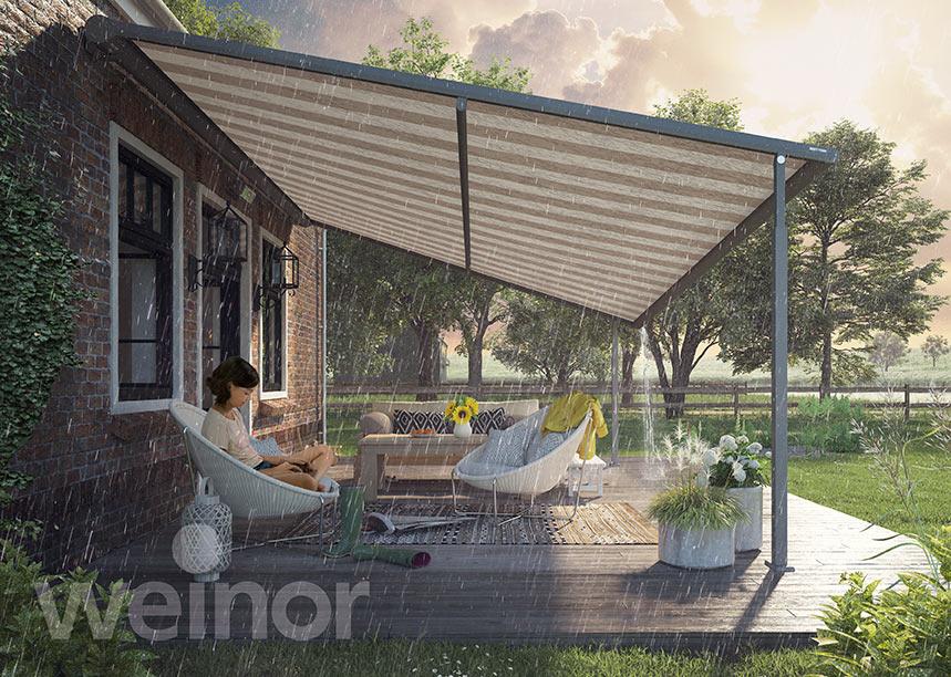 De Plaza Viva van Weinor is een stevige terrasoverkapping. De terrasoverkapping Plaza Viva zorgt er bij vrijwel alle weersomstandigheden voor dat u overdekt en beschut van de buitenlucht kunt genieten. Het zonweringsdoek is aan alle vier de kanten ingespannen, het doek loopt met een rits door een inlage in de geleiders. Dit maakt de overkapping zeer windvast en zelfs bij een flinke regenbui, op een warme zomerse dag, kunt u onder de overkapping heerlijk droog blijven zitten.