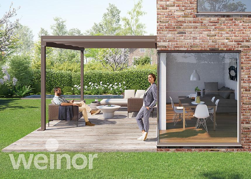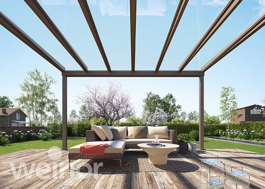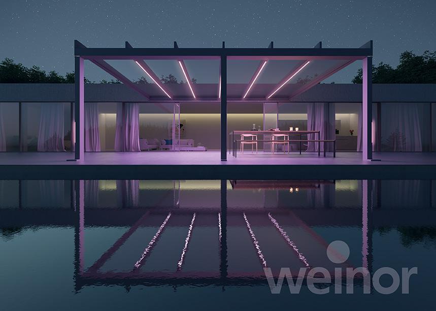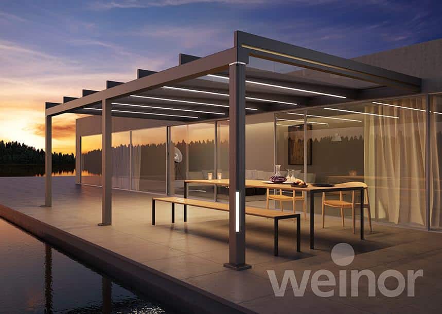 Door het moderne kubistische design is er van alles mogelijk bij de Terrazza Pure van Weinor. Omdat het frame volledig recht staat en alleen het glas er onder afschot in ligt, is het ideaal om er aan de zijkant of voorzijde een windvaste screen of glazen schuifwand in te zetten. Een goede zonwering onder het dak, mag bij een tuin op het zuiden, uiteraard niet ontbreken. Onze hoogwaardig RGB-kleur-LED-verlichting kan in de palen of in de dakliggers geintegreerd worden.